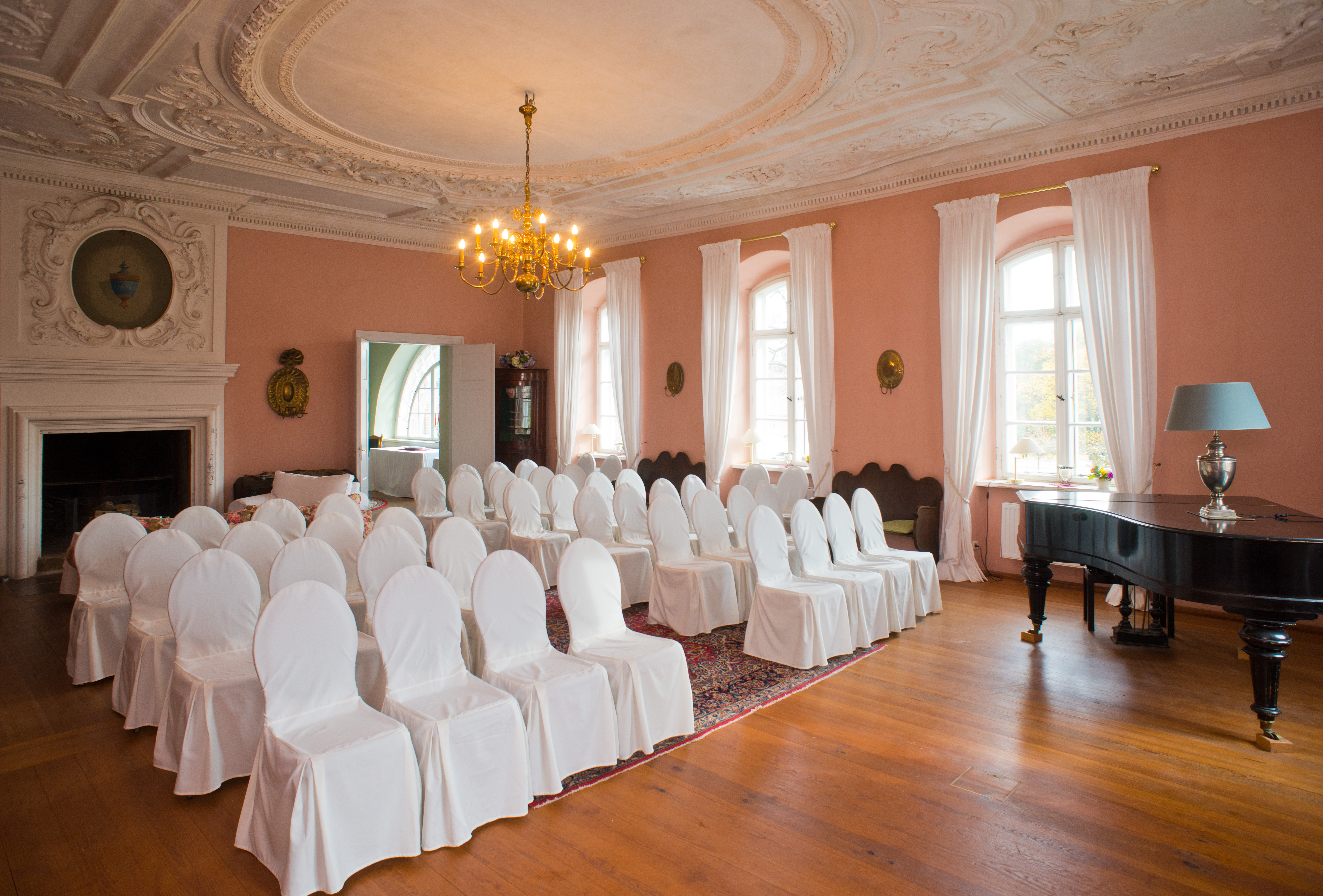 Der Barocksaal dieses zauberhaften Anwesens im Seenland Oder-Spree mit antikem Kronleuchter, stuckverzierter Decke und Wänden im zarten Rosé schreit: “Heirate mich!” Für die musikalische Untermalung der emotionalen Feierstunde steht sogar ein Flügel bereit. Das Gutshaus in Grenznähe zu Polen ist von einmaliger Natur umgeben – Badeseen, Oder und Spree laden zu Boots- und Paddeltouren ein. Ideal, um noch ein paar Tage länger vor Ort zu verweilen. Das Haus wird zur einen Hälfte von der Familie des Gastgebers bewohnt, die jederzeit bei Fragen zur Verfügung stehen und auf Wunsch ein köstliches Frühstück zubereiten.
