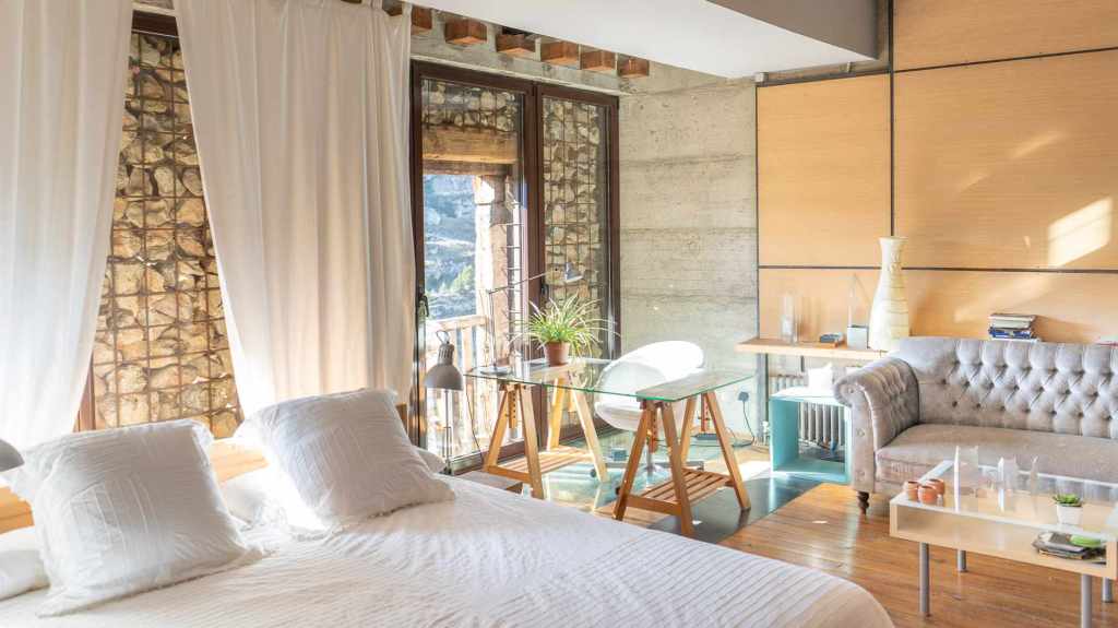 En este entorno se encuentra el loft rural en La Calata, un alojamiento que combina historia y diseño contemporáneo. Con capacidad para hasta 7 viajeros, la casa se distribuye en 3 niveles, con 3 habitaciones, y cuenta además con una chimenea de 8 metros y una terraza desde la que se pueden disfrutar las vistas, el sonido del río y el canto de los pájaros. Su decoración de inspiración neoyorquina crea un contraste sorprendente, fusionando la modernidad con la magia medieval del pueblo.