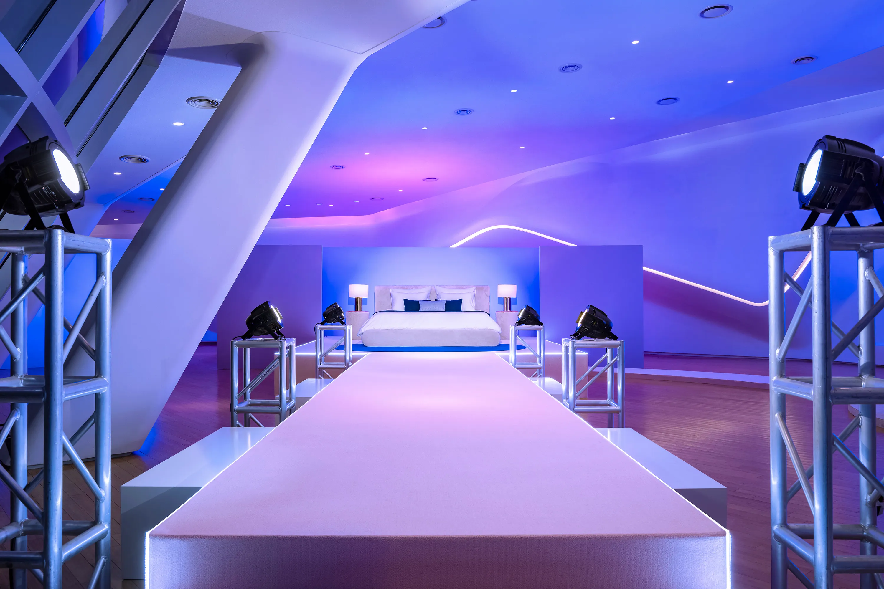 - 自撮りでポラロイド写真を撮る際の背景として最適な、ファッションショーのランウェイ。(貸切で利用可能)